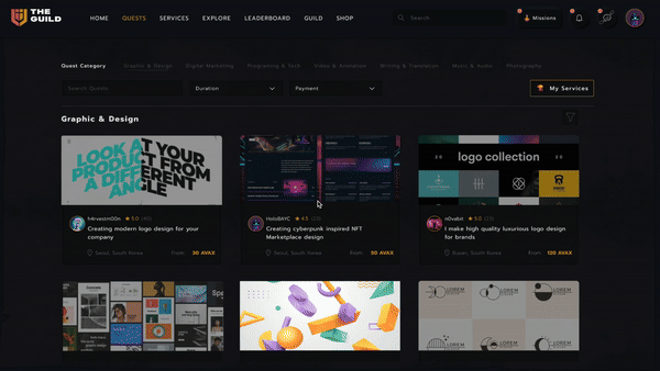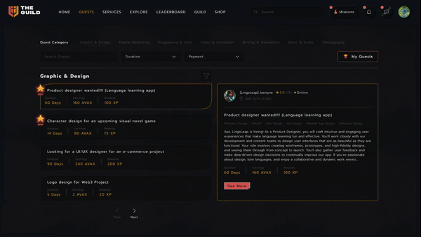 THE GUILD's Quests act as a decentralized job board. **Seekers** post tasks or projects in need of assistance from talented individuals with expertise to offer. **Solvers** can browse through and accept Quests where upon successful completion, the contract is settled and rewards are distributed. Our system is designed for collaboration and provides opportunities for community members to earn rewards through their skills.